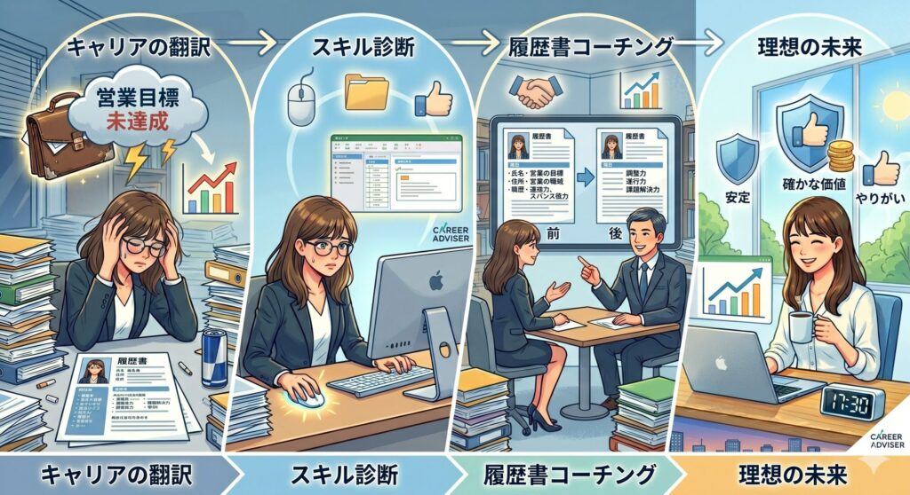 エージェントと一緒にこれまでの仕事を振り返ることで、あなたはあたり前だと思っていた営業経験が、事務職で重宝されるものだと気づきます。