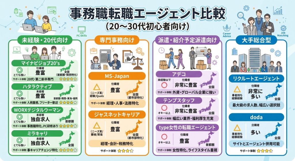 ここでは、前述のタイプ別基準を踏まえ、事務職への転職に強いと評価されるエージェントを厳選してご紹介します。